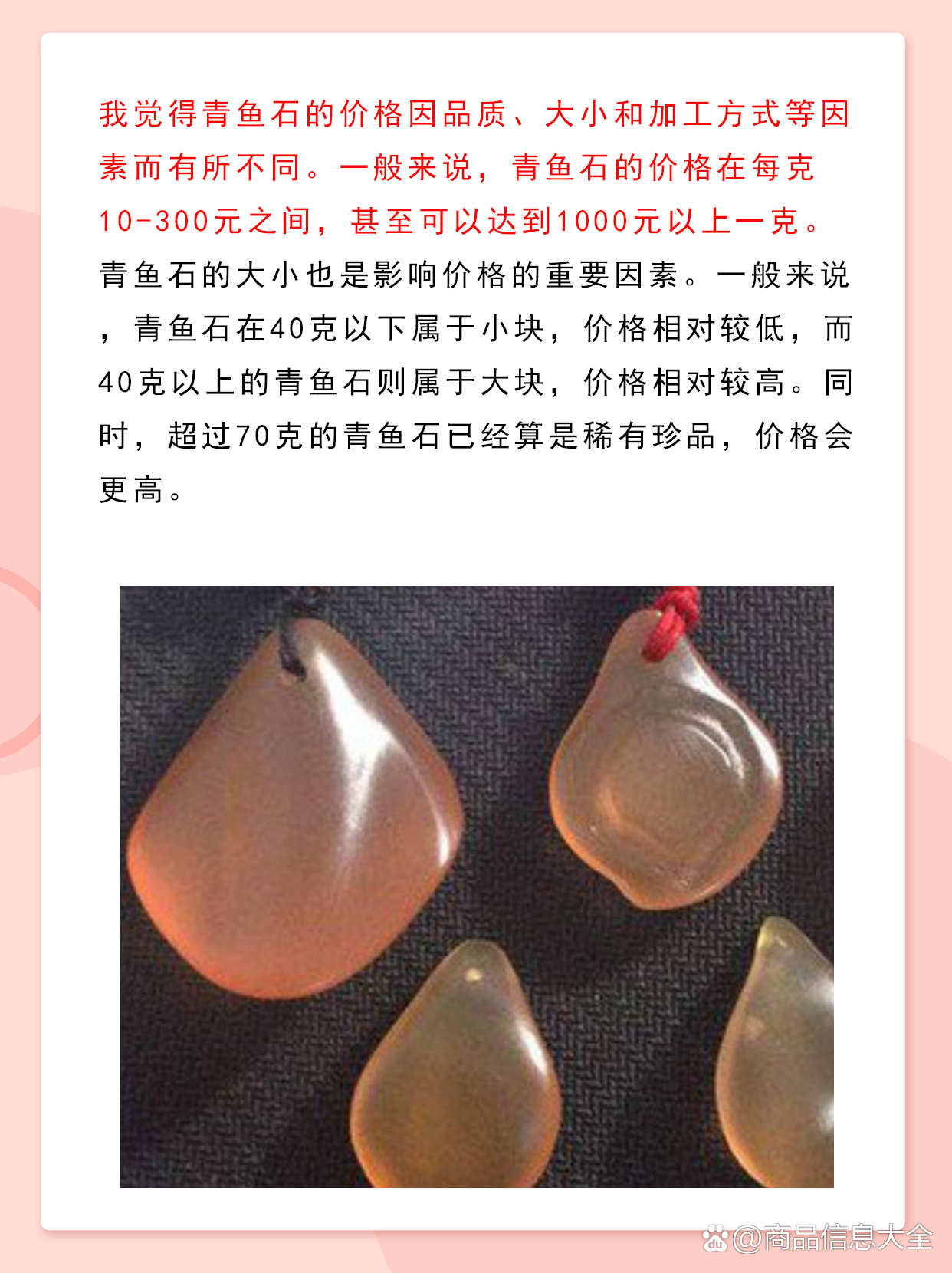 2、在“青魚(yú)石價(jià)格行情”部分,可以添加一些關(guān)于市場(chǎng)趨勢(shì)的分析,“近年來(lái),隨著人們對(duì)天然寶石的追捧和收藏需求的增加,青魚(yú)石的市場(chǎng)價(jià)格呈現(xiàn)出穩(wěn)步上升的趨勢(shì)?!?/p>